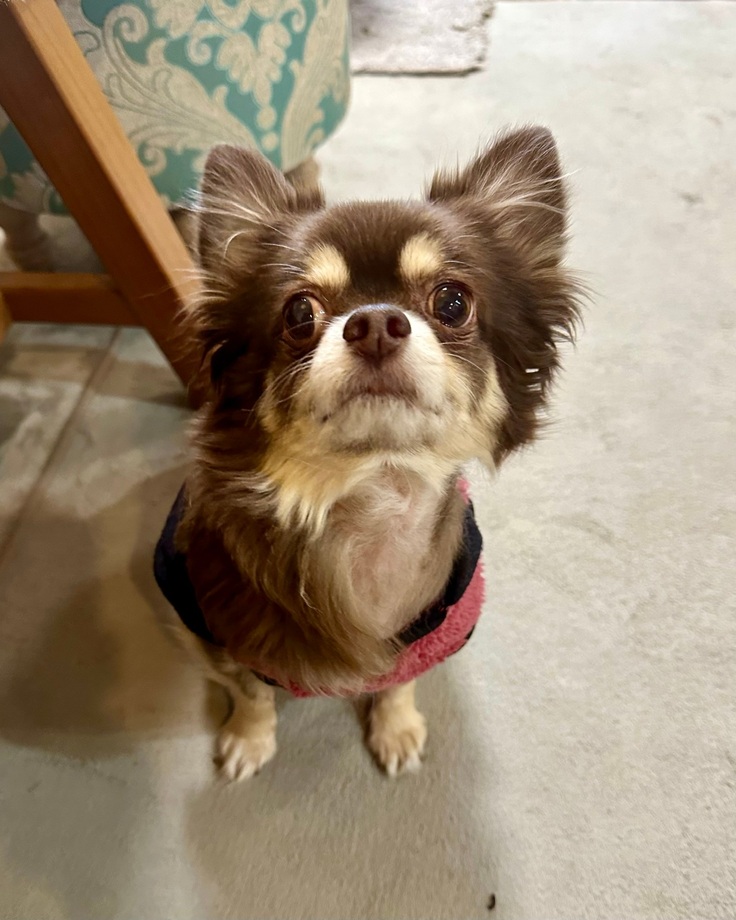 繁殖犬として、人間の為に子供を産み、心臓病も長らく患っており、捨てられたカフェで死んでいかなければならなかった命でした。私は偶然、たまたま、先住犬と顔が、カラーが似ていたので栗を見つけられただけ、、でした。
