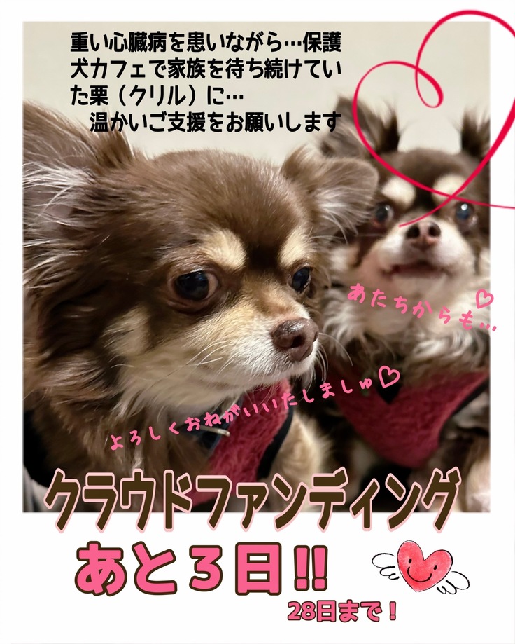 クラウドファンディングでは、皆さまに、今回の200万円を越える僧帽弁閉鎖不全症の手術検査費用の一部補填、という形で、ご支援をお願いしております。🙇♀️