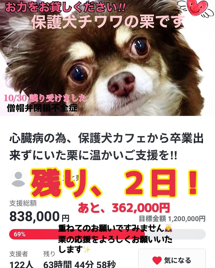 クラウドファンディングでは、皆さまに、今回の200万円を越える僧帽弁閉鎖不全症の手術検査費用の一部補填、という形で、ご支援をお願いしております。🙇♀️