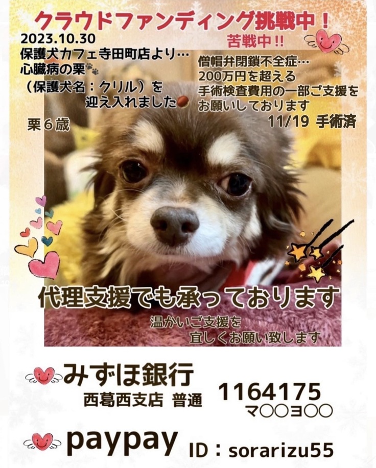 クラウドファンディングでは、皆さまに、今回の200万円を越える僧帽弁閉鎖不全症の手術検査費用の一部補填、という形で、ご支援をお願いしております。🙇♀️