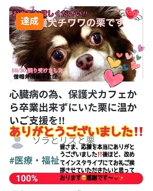 皆様の温かいご支援、応援、拡散のおかげで、17時25分。無事に目標金額に達成することができました!🐶🌹