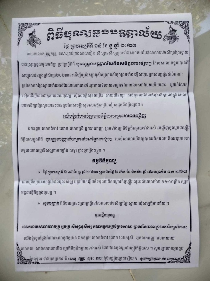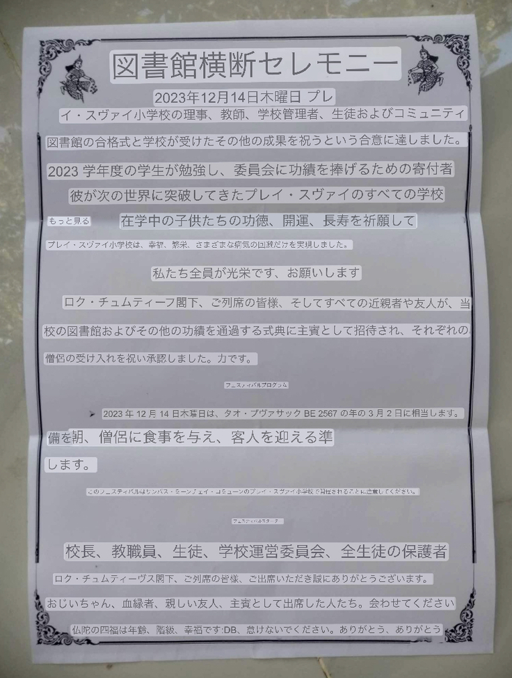 これは、クメール語で、地域の方々も招待して行われるとのことが書かれています。