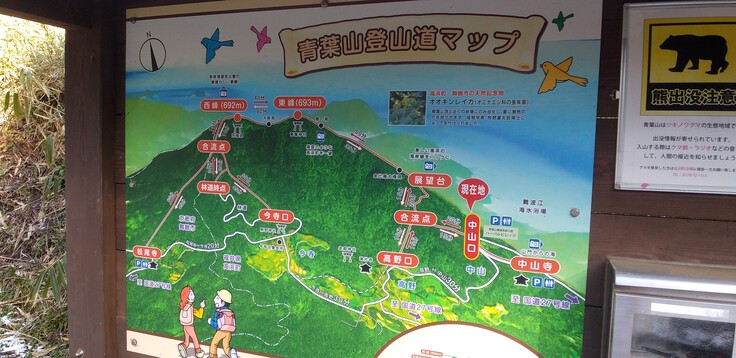 中山口→合流点→展望台→東峰(693m)→西峰(692m)→合流点→今寺口→高野口→合流点→中山口