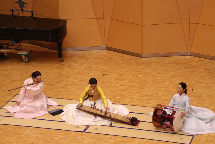 日本(尺八、箏、三味線)と韓国の伝統楽器(カヤグム、テグム、チャンゴ)の紹介。