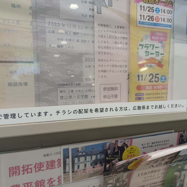 区役所にたくさん催し物のチラシが置いてあるコーナーがあったので、ぜひ置かせていただきたいと思ったけれど、札幌市や北海道の「後援」を受けている行事であることが条件とのこと。