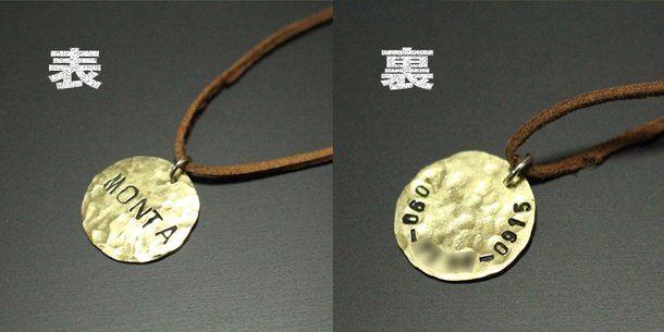 愛犬のお名前と好きな番号(誕生月や年齢)を刻印し、裏にあなたの電話番号を刻印したハンドメイド迷子札をお贈りさせていただきます。