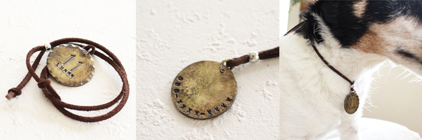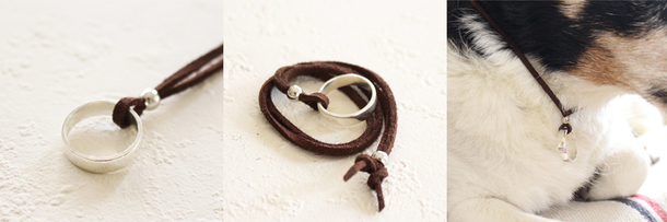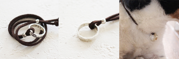 こちらの指輪型の迷子札は、通常の指輪に土目トンカチで叩いて生成した迷子札です。通常の指輪と違った雰囲気で革ひもと合います。こちらもサイズと幅は愛犬のサイズや、飼い主様の号数でお作りでき、指輪の内側に愛犬のお名前と迷子時の連絡先を刻印いたします。愛犬とのペアとしてもオススメです。