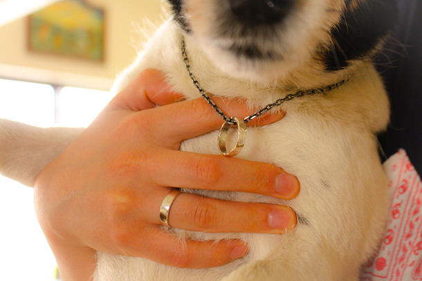 こちらのリターンでお送りする迷子札は、指輪型の迷子札です。『愛犬とペアで身に付ける迷子札があればかわいいな』と思い考えました。サイズと幅は愛犬のサイズや、飼い主様の号数でお作りでき、指輪の内側に愛犬のお名前と迷子時の連絡先を刻印いたします。
