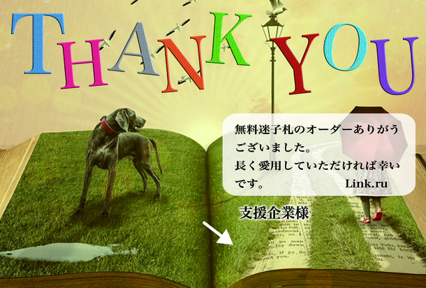 こちらのリターンは企業様向けとなります。迷子札をお送りする際に同封するサンキューレターに支援企業としてお名前をいれさせていただきます。