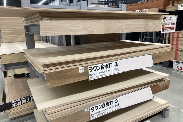 合板とは木材を薄くむいた単板に接着剤を塗布し奇数枚を貼り合わせたものです。合板の用途は多岐にわたりますが、熱帯材合板の場合、フローリング用台板や建設基礎工事のさいにコンクリートを流し込むための型枠として使用される例がほとんどです。普段の生活環境ではあまり馴染みのない木材製品ですが、大型ホームセンターの合板売り場に行くとサイズや素材の異なる何種類もの合板製品が平積みされているのを見かけます。