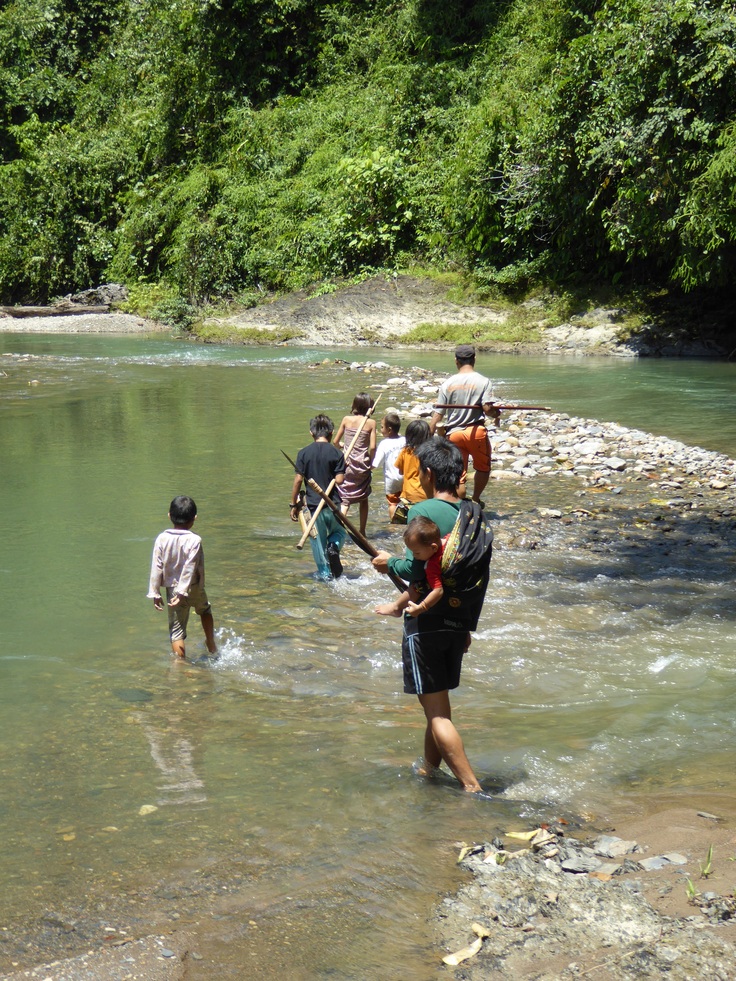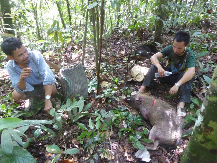 Long Saitは70年ほど前に定住を選んだプナン人たちで、移動型の焼畑耕作と狩猟や漁労などを生業としています。滞在二日目、朝の6時にたたき起こされて、村から徒歩で一時間ほどかけてセランゴー河の対岸にある狩猟場に向かいました。同行のハンターのうち、一人は村長の長男、もう一人はプナン人狩猟家たちにとってグル(師匠)と呼ばれているケニャ人。彼らにとっては日課の朝の散歩といったところでしょうが、すでに高齢者の領域に入った自分にとっては必死の行軍ともいえる辛さです。狩猟場の森に入って二時間ほど経った頃でしょうか、一頭の狩猟犬が突然、数十メートル先で吠え声を挙げます。途端に二名の狩人が脱兎のごとく、急峻な獣道を疾走しはじめます。犬に追い立てられた獲物は迷走しているのでしょうか、二人も四方八方に駆けずり回っているようです。森を駈ける足音、荒い息遣いが奥から聞こえてきます。20分ほどしてからケニャ人が、なすすべもなく呆然と立ち尽くすままの自分たちの元に戻ってきました。彼に導かれて尾根にあたる場所にたどり着く。背部にマシェット(山刀)の一撃を食らった、幼獣ともいってよいヒゲイノシシが横たわっています。打ち込み傷から見える肉のピンク色が鮮やかです。犬たちの追走に疲弊したところを一回で仕留めたといいます。体重は30~35キロほどでしょうか。その日の遅い昼食から翌日の朝食まで多彩なイノシシ料理のご馳走に預かったのは言うまでもありません。