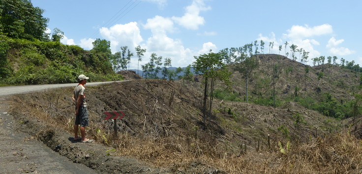 森での狩猟採集の生活から定住を伴う農耕スタイルへの遷移はプナン人にとって、決して《近代化》を意味しません。むしろ生存するための苦肉の策と言ってもいいでしょう。森はただ生活の場所だけを意味しているのでありません。信仰や文化は森というミクロコスモスと分かちがたく存在しています。Ba Puakの場合、周辺はすでに伐採企業二社の伐採施業区域となっています。幹線道路まで出れば、メランティなどの木材や合板を満載したトラックがひっきりなしに往来しています。実は彼らが農作をはじめた山も伐採会社の事業地の中なのです。いまのところ第三者の仲介で軋轢は生じていませんが、将来は強制退去されてもおかしくない状況です。