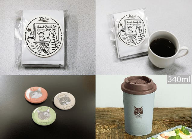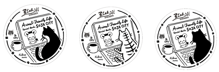 このクッキー缶のデザインと、コーヒーのドリップバッグをまとめているOPP袋に貼ってあるシールは、私たちの先輩である、県大の卒業生、広石かよさんが作ってくださいました! ロイ君をイメージしたぶち猫、よつば君をイメージしたキジトラ、ゴシック君をイメージした黒猫の3匹のねこちゃん達と、総社市のマスコット、チュッピーが登場しています! セット名にあったねこちゃん達のシールをお届けします!(※3匹の猫セットのみシールはランダムです。)お菓子やコーヒーと一緒にぜひ、素敵なデザインも楽しんください!