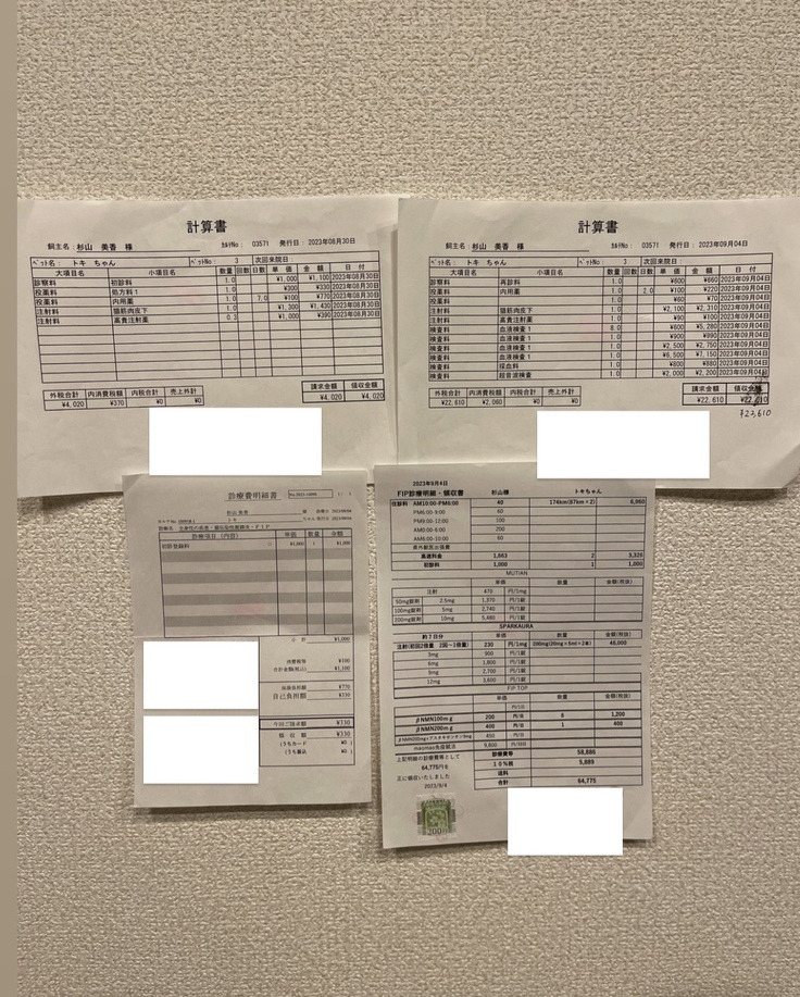 ②補填対象の治療名と金額: FIPの薬は保険が使えませんが、経過観察の血液検査、エコー検査は7割の支払いは補填されます。