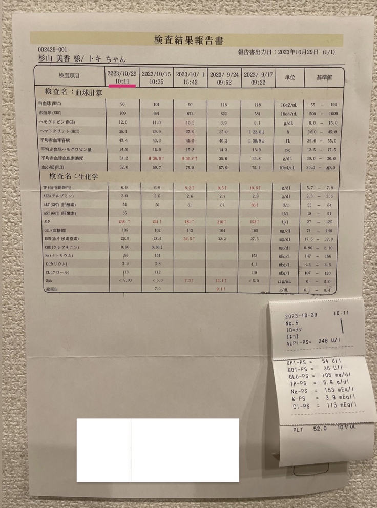 この頃、SNSでFIPになった猫ちゃんの事を知り、腹部の膨れは腹水ではないかと不安になり再びかかりつけを受診し、血液検査、状態からFIPを疑われる