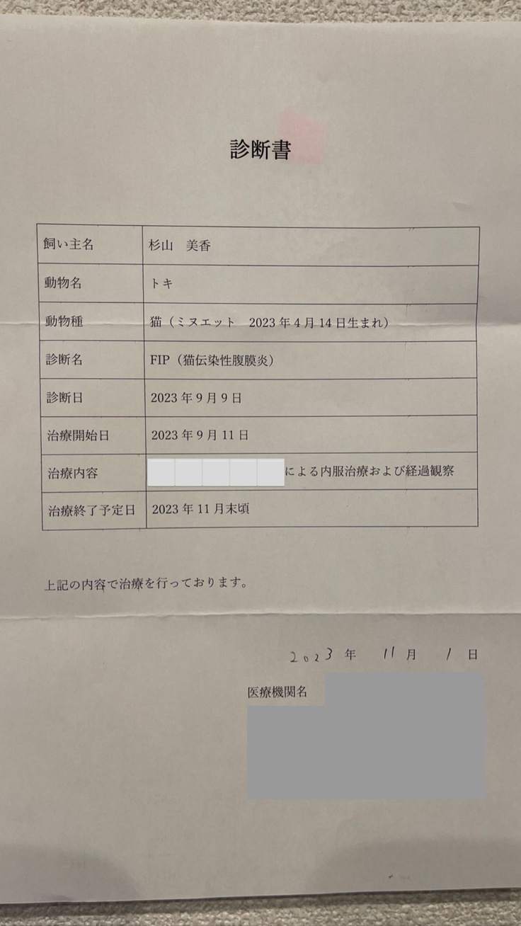 3割の実費分とFIPの薬代をプロジェクトで集めさせていただきます。