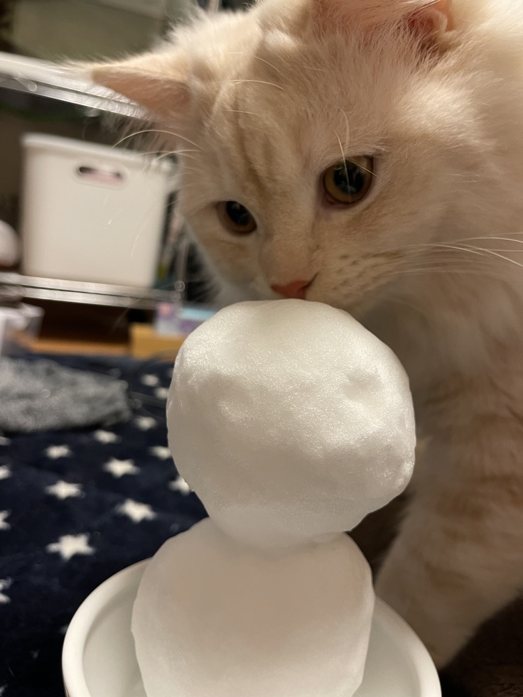 もなandキュウも雪だるまに興味津々でした😸