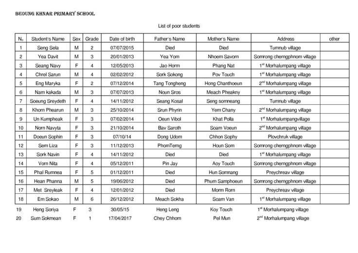 ②コンポンスプー州ボンクナー小学校の20の貧困世帯への毎月の学費支援 各10$×20=200$