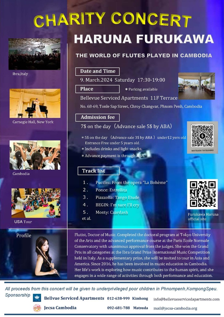 2024年3月9日、プノンペンのチュロイチャンバー地区にある、Bellevue Serviced Apartmentsにて、フルーティスト古川はるなさんのチャリティコンサートが行われました。