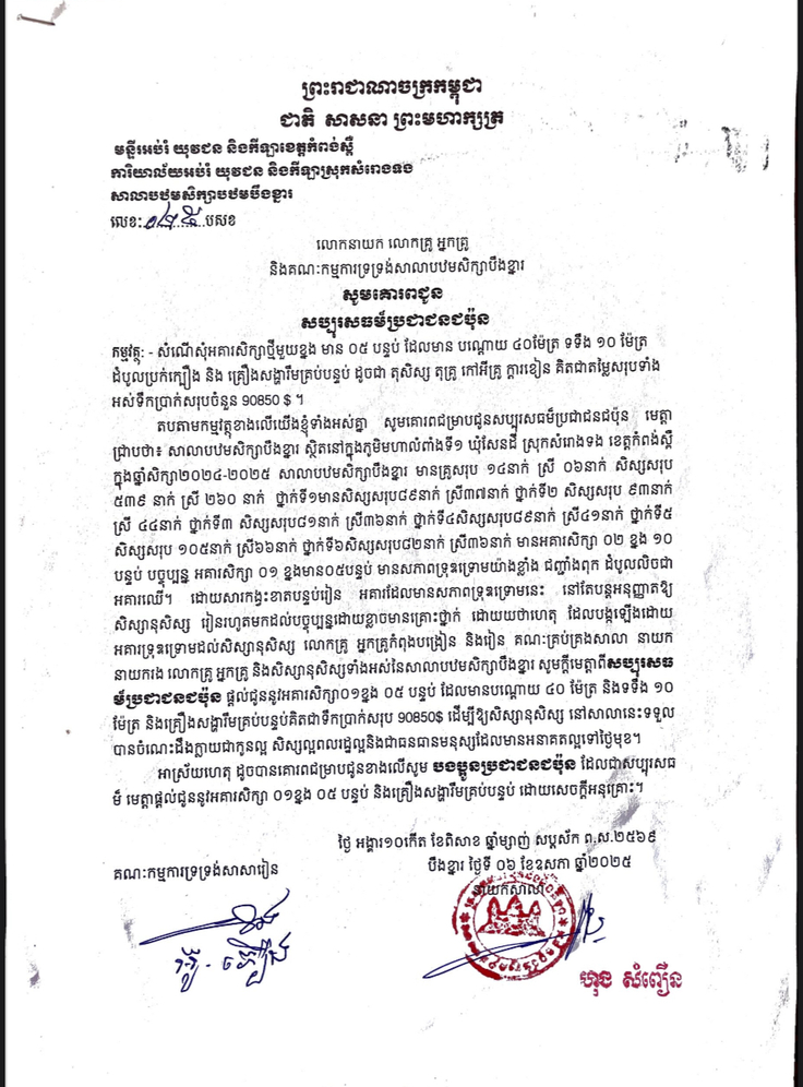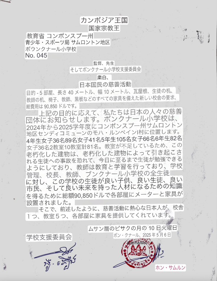 新校舎には、ご支援者のお名前が大きく記載されます。また、カンボジア教育省より感謝状が贈呈されます。