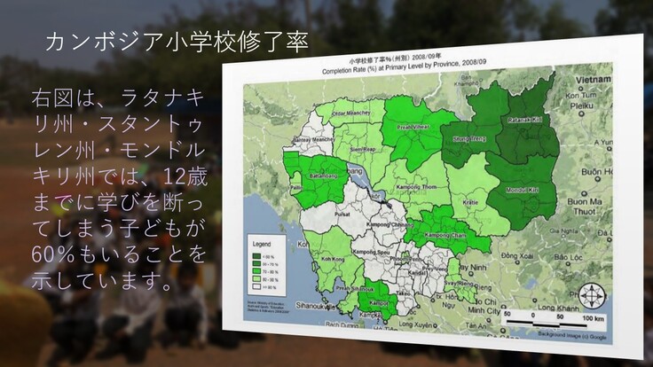 - 中学校を卒業しないで退学する生徒が全就学人口の約半数であることが、カンボジアの教育の大きな問題点として挙げられます。