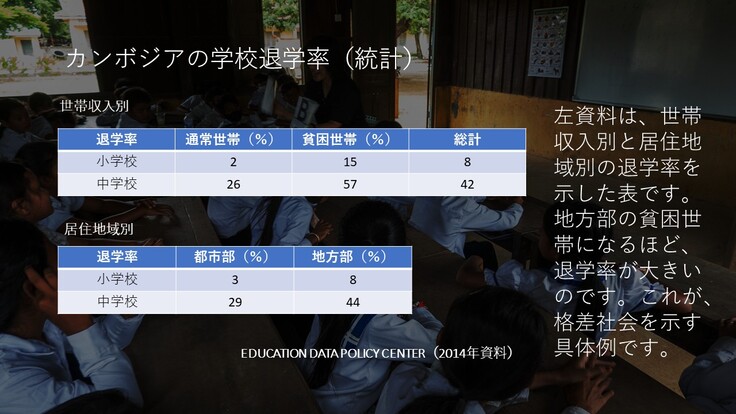 もう、皆様には既に、お伝えしていることと思いますが、カンボジア全土の統計では、中学校(9年生)までに『42%』もの子どもたちが退学しているんです。