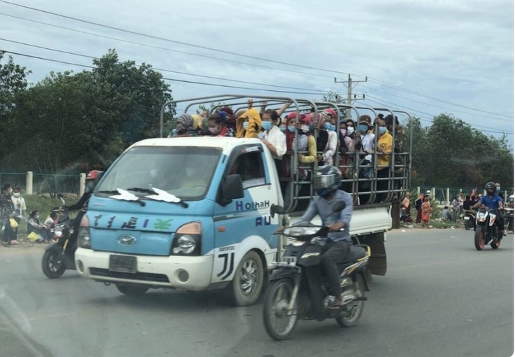 輸出港のあるシアヌークビルへのアクセスのよいコンポンスプー州では、この工員さんたちを立ち乗りさせたトラックの数々が、各工場の終業時刻のPM4~6時には、道路を埋め尽くします。
