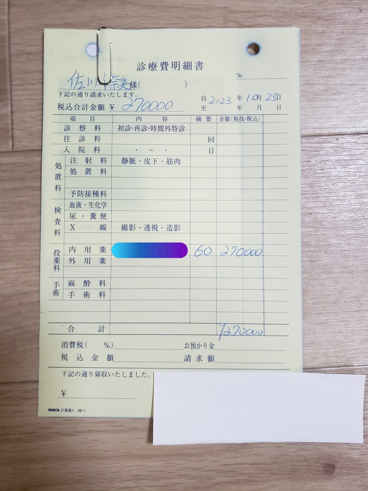 後ろ足は神経症状がでているとの事で、FIPの治療の一環として使われる注射を投与してもらい、必要なお薬を処方してもらいました。急だったので後日、治療に使うお薬は自宅の方へ処方して頂きました。