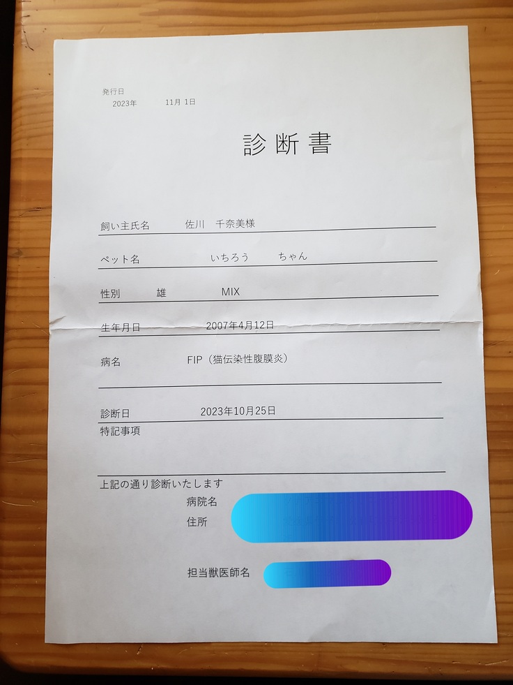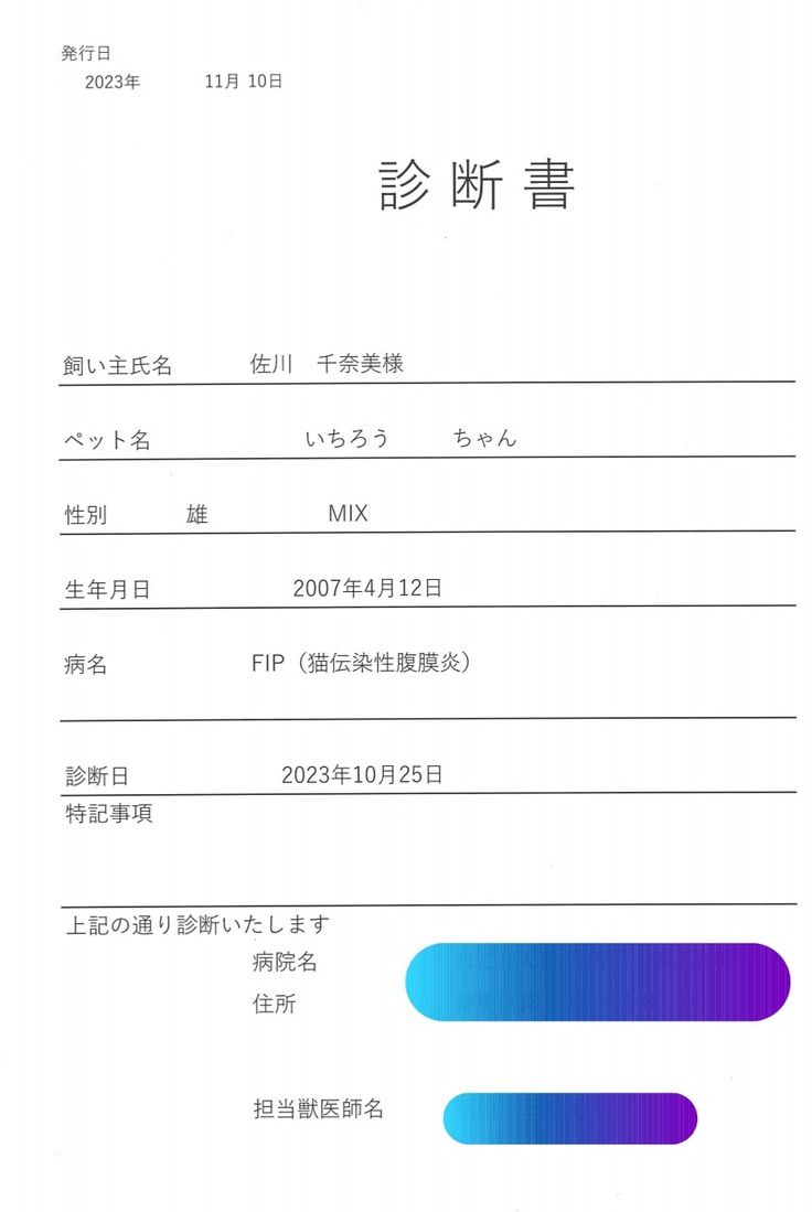 お迎えに行くと獣医師の説明によれば、FIP(猫伝染性腹膜炎)で間違いないと診断されました。