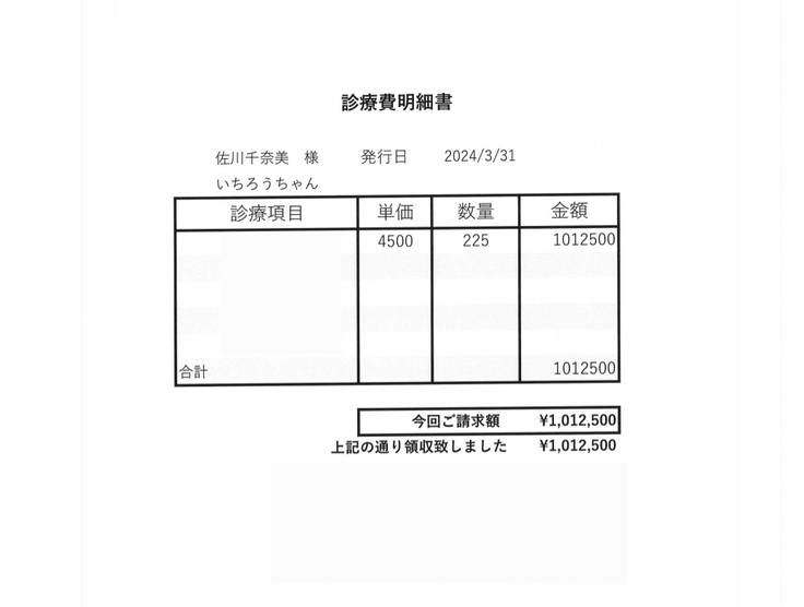 お薬代の全額のお支払いは厳しいので、ご支援頂きました支援金プラス自己負担にてお薬代の一部金額の1,012,500円(4500円×5粒/45日)を入金致しました。