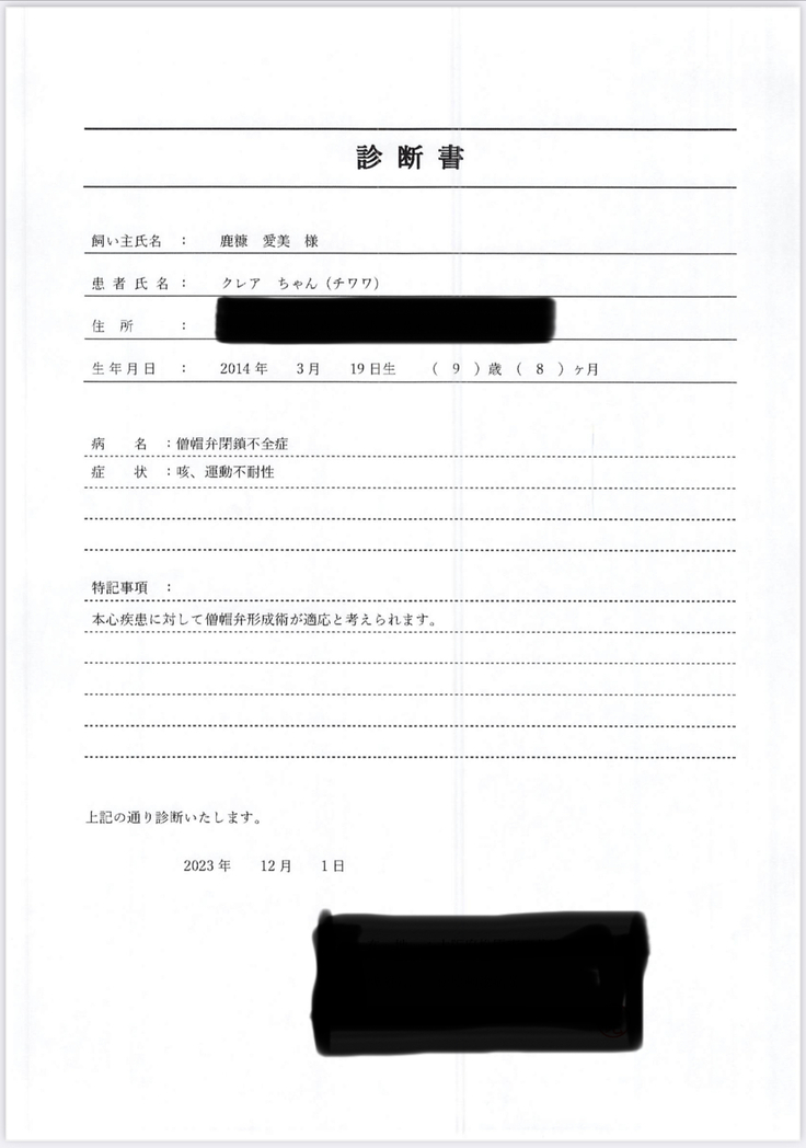 皆様からお力添えをいただき、クレアに1日でも早く僧帽弁閉鎖不全症の手術を受けさせていただきたいです。