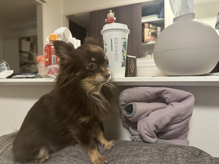 テーブルの上のご飯をいたずらしそうになったり、今日はソファーの背に乗って、カウンターからキッチンを覗いて何か食べるものがないか物色してました🤭