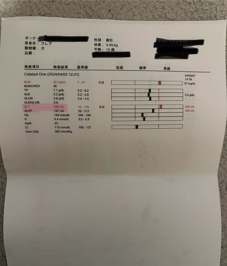 まだ数値が高いもの、そして胆のうの炎症が結構あるので引き続き投薬で様子を見る必要がありますが、数値的にも良くなっていて良かったです😮💨