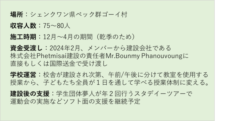 今年の夏に、シェンクワン県スポーツ教育庁に訪問した際、バーンゴーイ小学校に学校が増設できれば、子どもたちが授業を分けることなく通えるようにするだけでなく、政府から教員の増員を行い、教育環境の改善に努めるとのお話をいただきました。