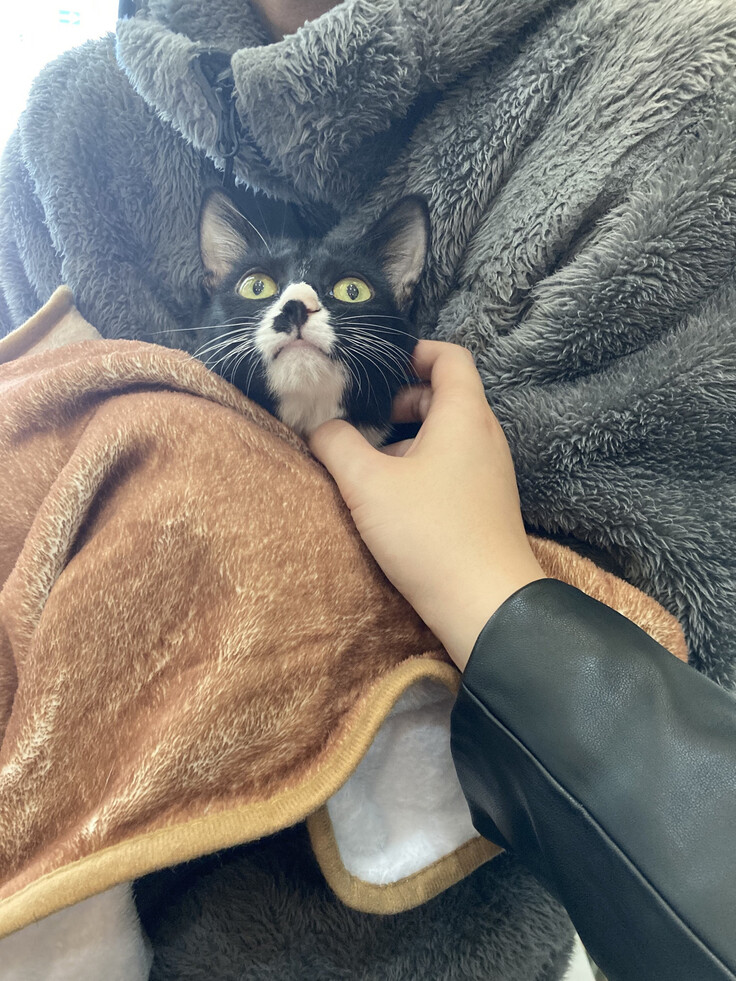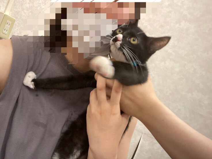2023/07保護猫譲渡会で初対面の私たち上に飛び乗り甘える2匹に惹かれ、詳しく譲渡の注意点などを聞きました。