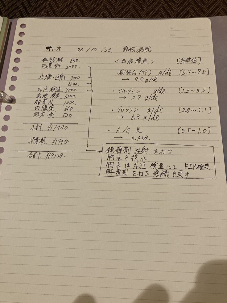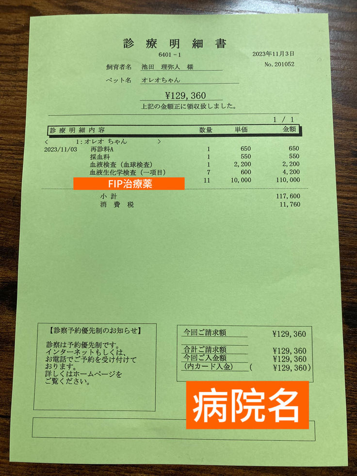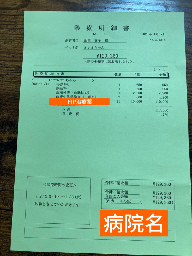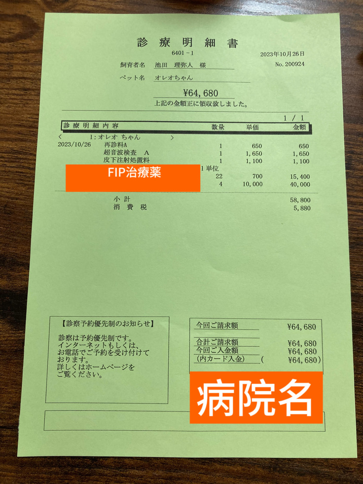 保護猫オレオのFIP診断~寛解目標を目指す治療費用として、約876,750円 事務手数料として約173,250円
