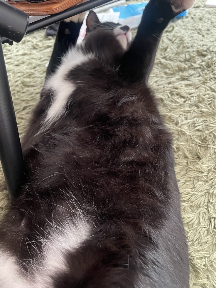 机の下でお腹を出して寝ているオレオ