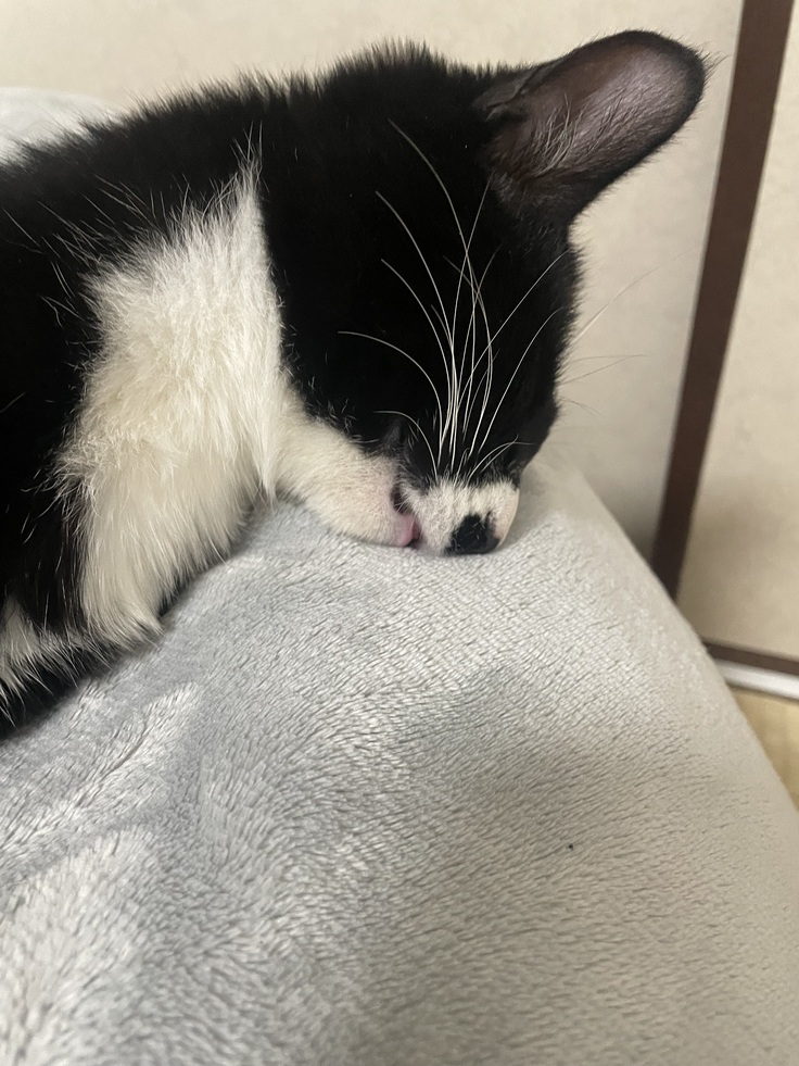 膝の上ではなくなでなで待ちのまま膝前で寝るリッツ