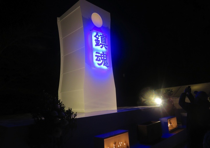 開催当初からこの鎮魂祭が執り行われ、太平洋戦争で亡くなった方々の慰霊を行ってきました。そして、遺族会や市民、観光客が鎮魂の塔に手を合わせろうそくを灯します。