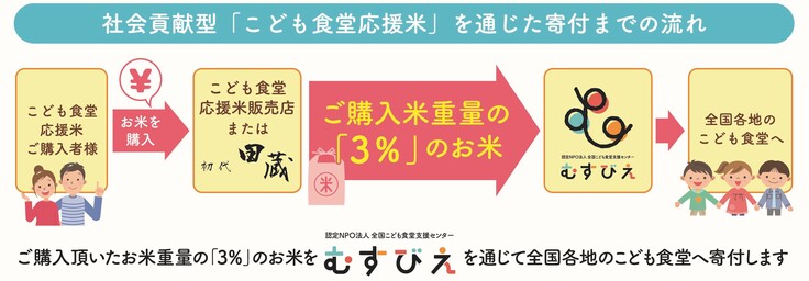 皆様にご支援いただいた「お米の総重量の3%」を認定NPO法人全国こども食堂支援センター・むすびえ様を通じてお米の支援を行います。