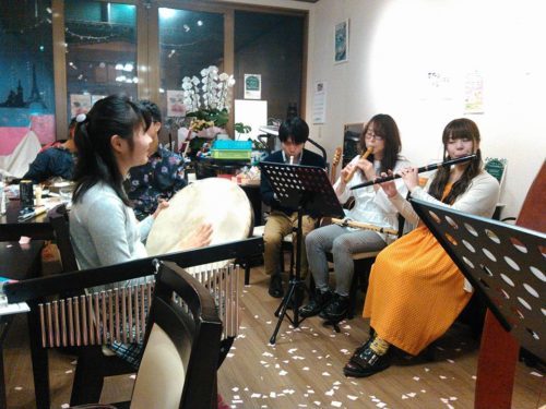 お店を続けていられるのは、想いに賛同してボランティアスタッフとしてサポートしてくれる友人、先輩、後輩たち、そして「ストレスフリー」のユニット名で活躍する「ハープ王子とフルート姫」のお二人のおかげです。知的障がいのある自閉症の女性は、すっかりフルート姫のファンです。