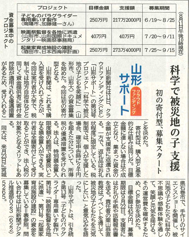 8月12日の山形新聞に今回の取り組みが紹介されました。最初の寄付型でのクラウドファンディングです。ご支援よろしくお願いいたします。個人では、確定申告の時に所得税の優遇措置が受けられます。法人は、損金算入ができます。