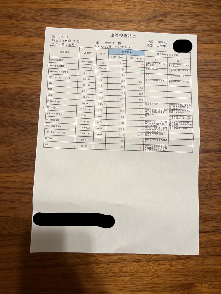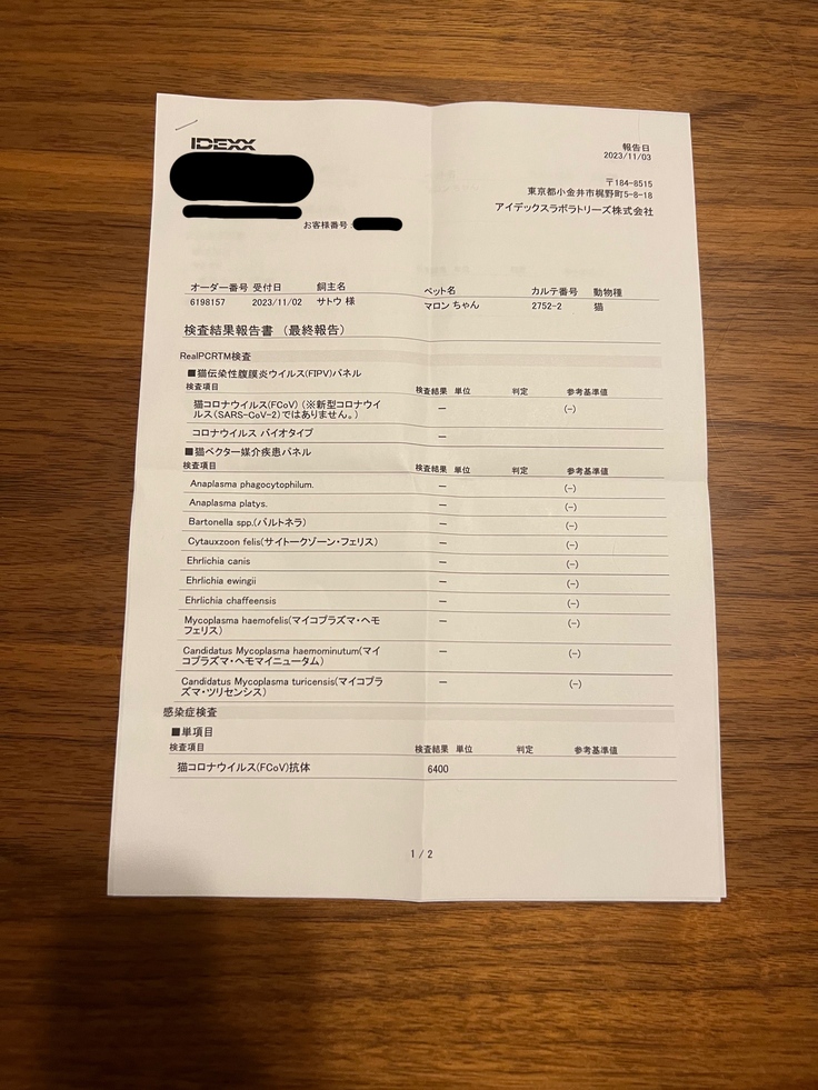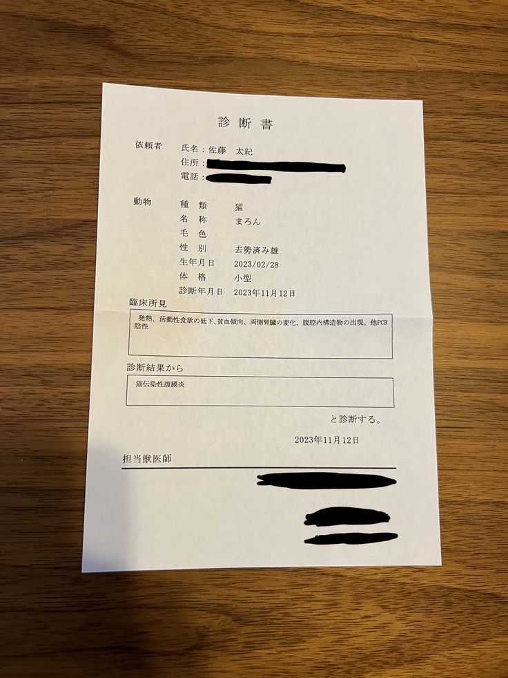 その後病院に行き血液検査、エコー検査、腹水の検査を行い、総合的な検査の結果FIPの診断を受けました。
