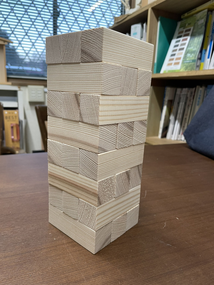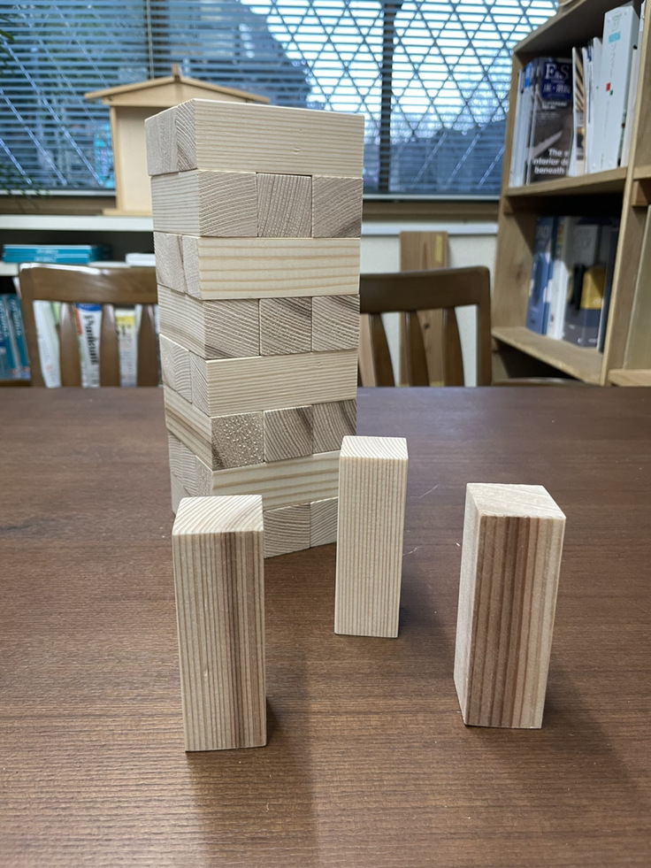 また、天竜材の積み木を利用したバランスゲームは、積んだり、抜いたり、引っ掛けたり、バランスを取りながら、ハラハラドキドキを楽しめるおもちゃのひとつです。手先や指先を注意深く使うことによって、脳の働きの活性化をサポートすることから、幼児の知育玩具としても注目されています。