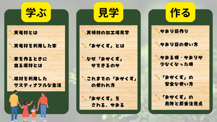 できれば天竜材か育つ森にふれ、加工の現場を子供達が見ることで、