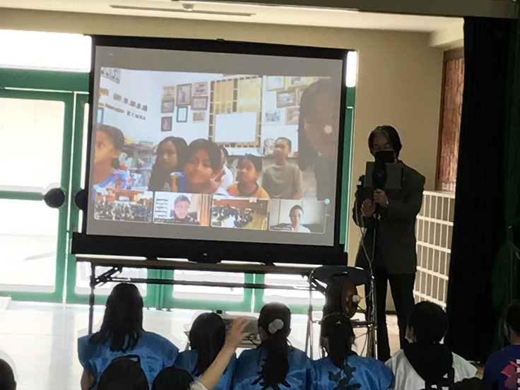 コロナ禍の2020年に、シュムリアップのマンゴースクールとオンラインで繋ぎ、それぞれの学校や地域についてのプレゼンと、同じ事を一緒にする目的で、カンボジアの子供も知っている「幸せなら手をたたこう」をそれぞれが歌い、最後は合唱をしました。