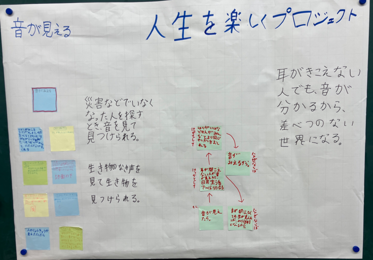 また、未来創造型探究として、コニカミノルタ株式会社AccurioDXチームから依頼があった「未来にみえる」をテーマにグループで話し合い、提案するアイデアを考え、探究リンクプロジェクトでプレゼンテーションをしました。