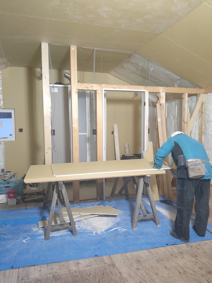 '''通気胴縁(外壁の前に空気を通すためにはる板)、外壁1度塗り、転び止め(垂木の間に固定させる板)''を取り付けてる動画です☺️