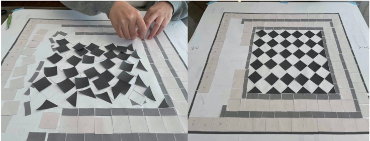 ★床タイルの割り付け風景(タイルの無償譲渡会で頂いたタイルを使います)