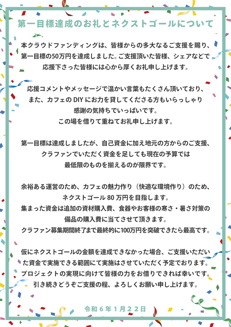 私たちの自己資金の他に地元の方々からの応援、市からの補助金を頂きましたが、どうしても予算が足りません。現在、工事費などがかなり不足している状況ですが、補助金の関係で2024年2月にオープンしなければならない為、資金が十分に集まっていないなか2023年12月に工事着工予定です。